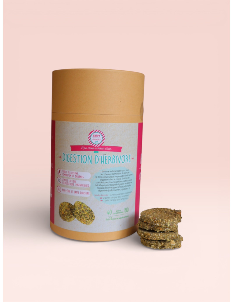 La cure de première intention lors de troubles digestifs, problèmes gastriques et sensibilité digestive. Digestion d'herbivore est une source naturelle de pré et post biotiques, riche en béta-glucanes et aussi en fibres, indispensables pour prendre soins de la flore cellulolytiques du cheval herbivore !