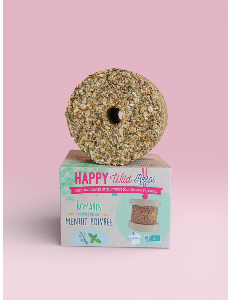 Jouet gourmand Bio à suspendre pour occuper votre cheval au box ou tout simplement pour lui offrir une friandise healthy et 100% végétale, sans colorant, mélasse ni additif. Happy Wild répond au besoin naturel et physiologique de votre cheval de ronger, lécher et mastiquer. Happy to be a wild horse !