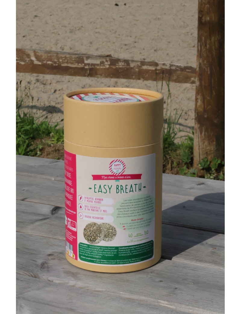 Easy Breath est une association de plantes pures, d'huile essentielle de Pin maritime et de miel de fleurs Bio. Easy Breath soutient le système respiratoire des chevaux pouvant être irrité de manière ponctuelle ou chronique, pour une respiration apaisée.