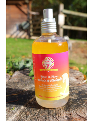 Composition Sérum Bi Phase Sabot et Périople : Huile de pépins de raisins, huile de lin*, huile de tournesol*, huile d'abricot, macérât huileux de Figuier de Barbarie, huile essentielle de pamplemousse rose, gel d'aloès Véra, glycérine végétale, vitamine E naturelle.