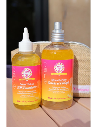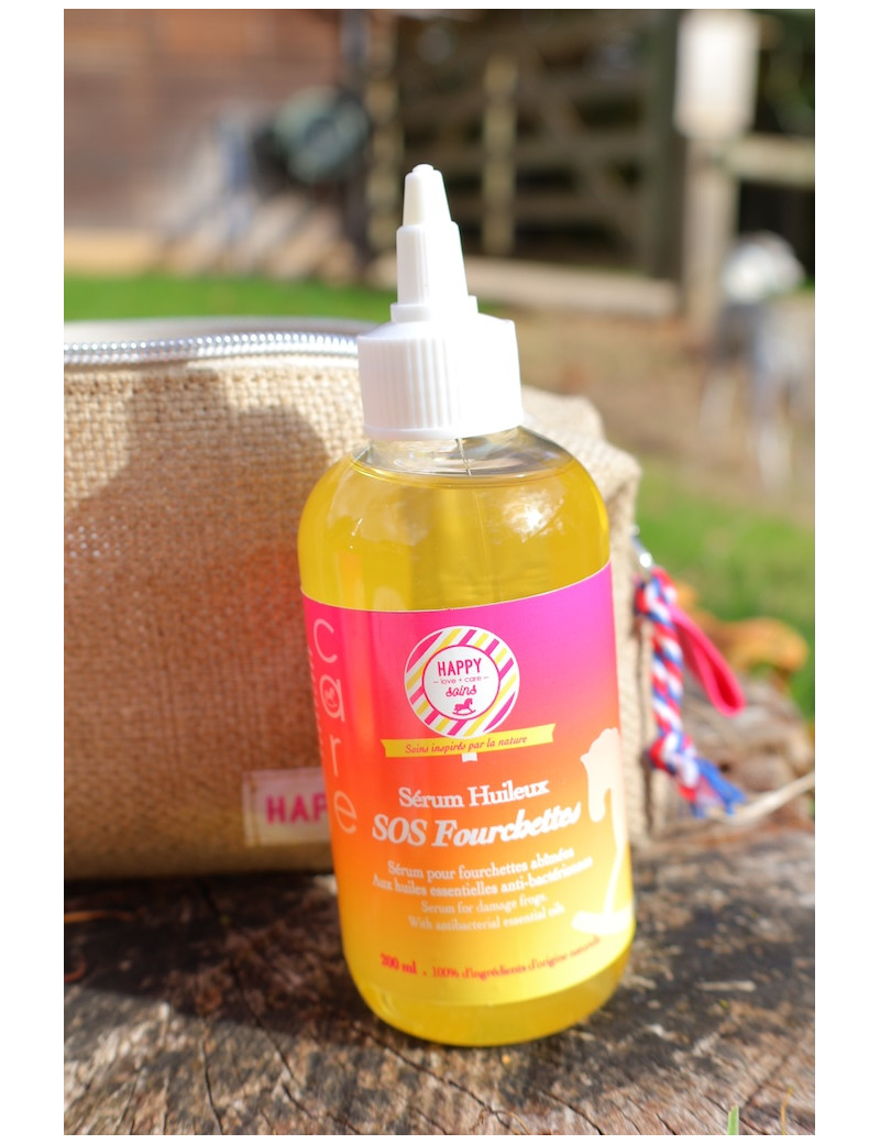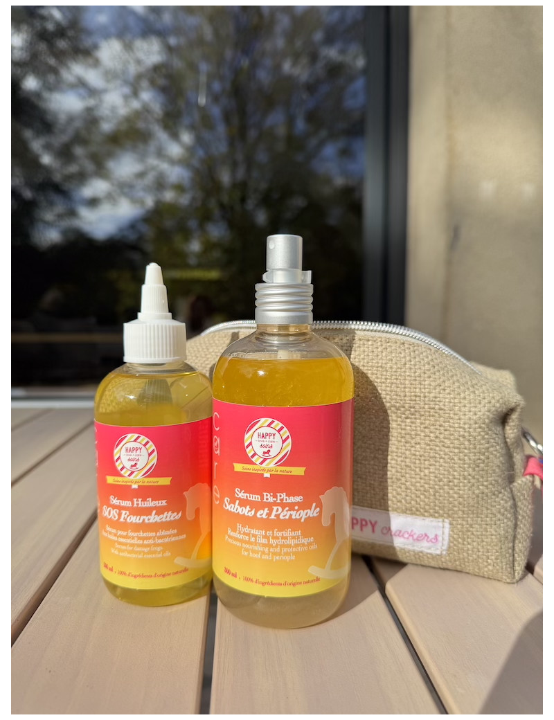 Ce pack est composĂ© d'une trousse en lin faite main en Normandie, du sĂ©rum Bi-Phase Sabots et PĂ©riople 300 ml, et d'un sĂ©rum SOS Fourchettes 200 ml.Â