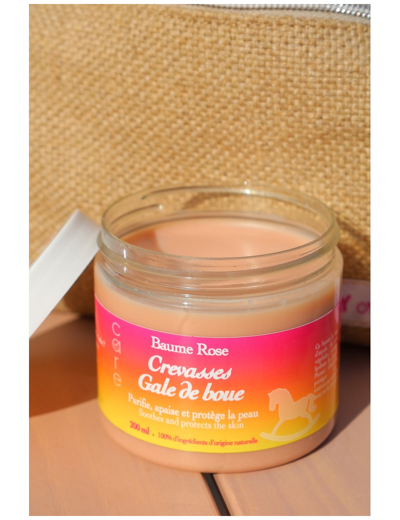 Composition Baume Rose Crevasses Gale de boue : Huile de coco, huile de tournesol, cire végétale, beurre de karité, huile de pépins de raisins, huile de jojoba, argile rose, oxyde de zinc, fragrance orchidée, vitamine E naturelle.